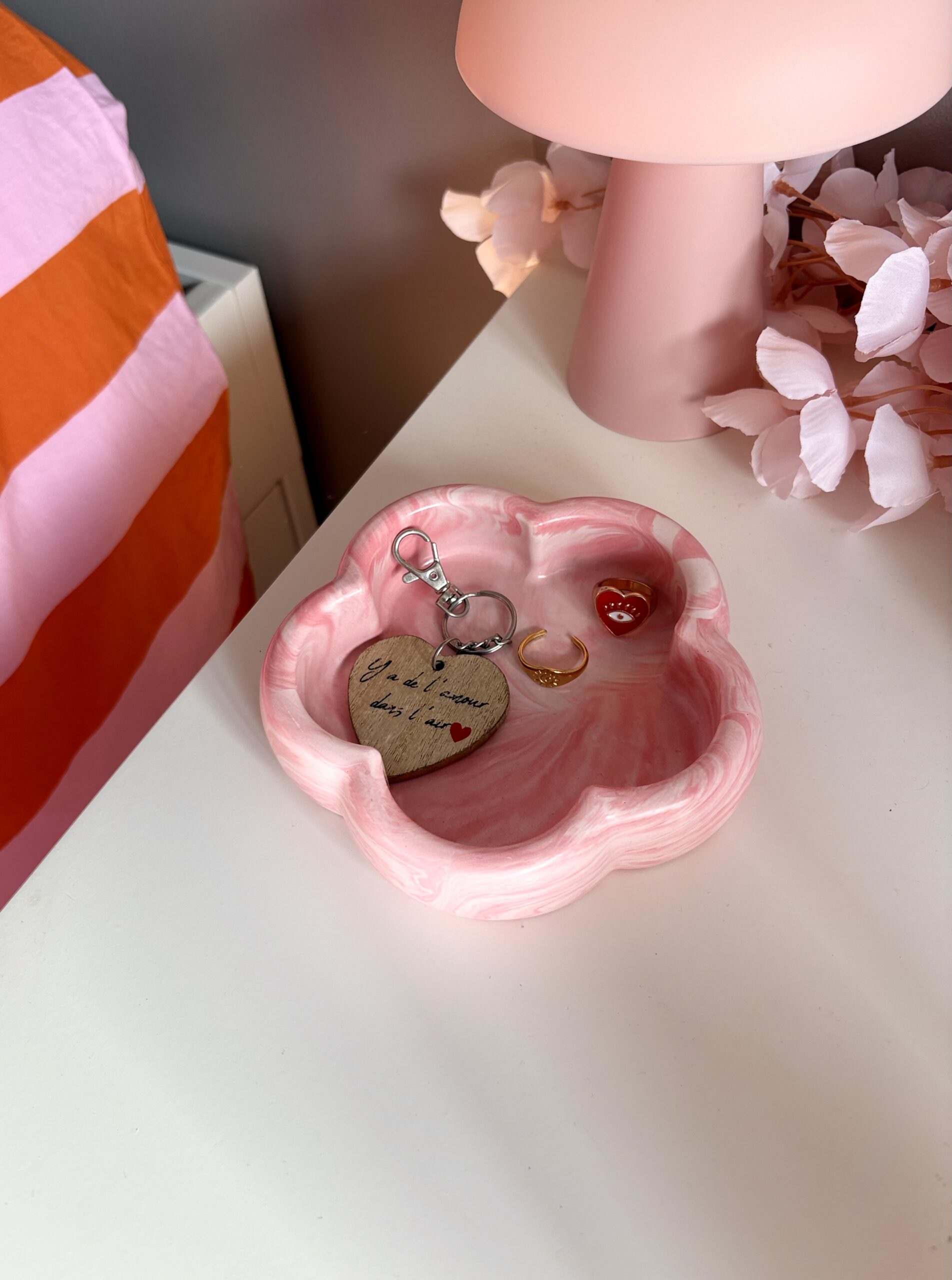 Ce vide-poche en forme de fleur est fabriqué en jesmonite, une résine minérale naturelle non toxique et respectueuse de l’environnement.
