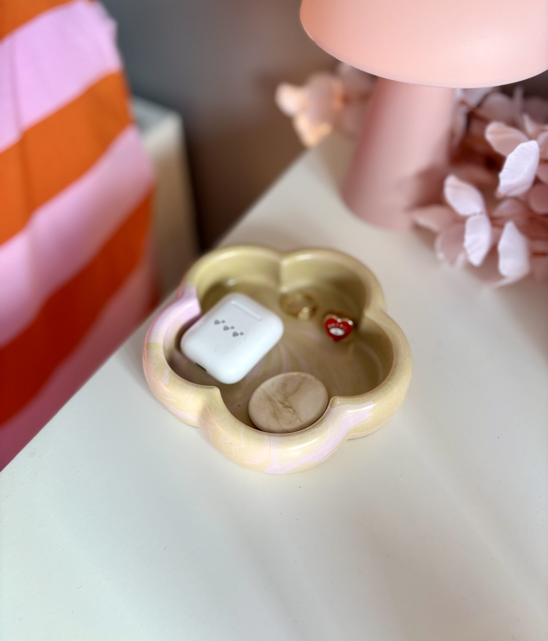 Ce vide-poche en forme de fleur est fabriqué en jesmonite, une résine minérale naturelle non toxique et respectueuse de l’environnement.
