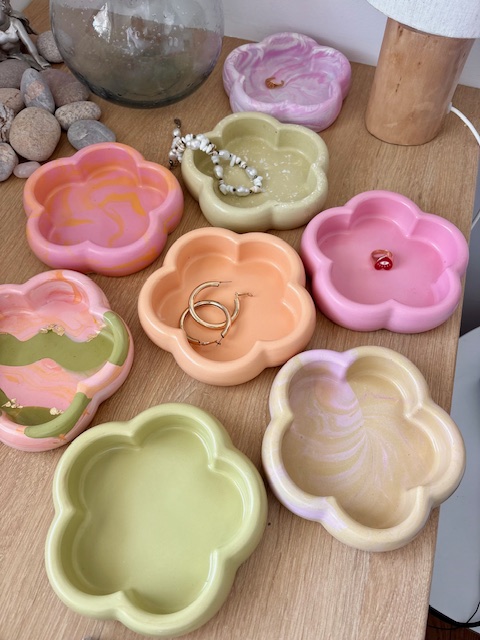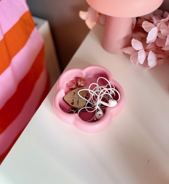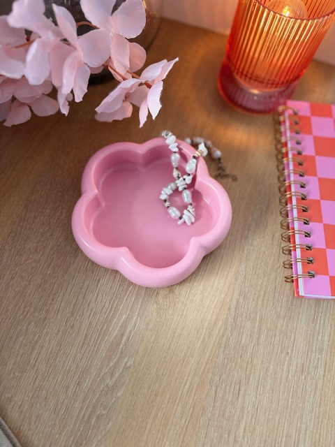 Ce vide-poche en forme de fleur est fabriqué en jesmonite, une résine minérale naturelle non toxique et respectueuse de l’environnement.